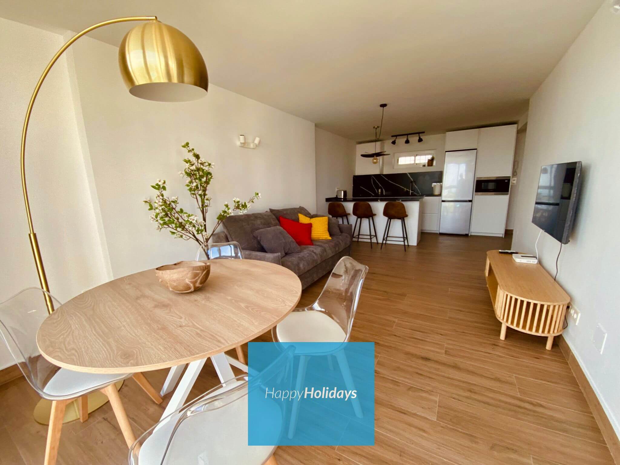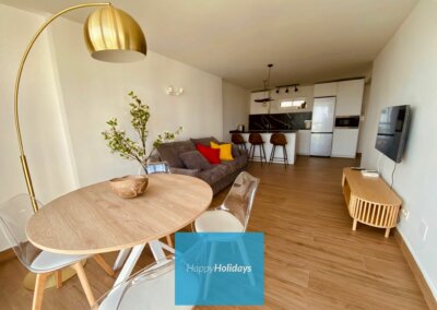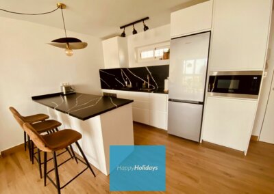 El apartamento dispone de aire acondicionado, lavavajillas, lavadora y todos los elementos necesarios para que te sientas como en casa, tanto en estancias cortas como más largas.
