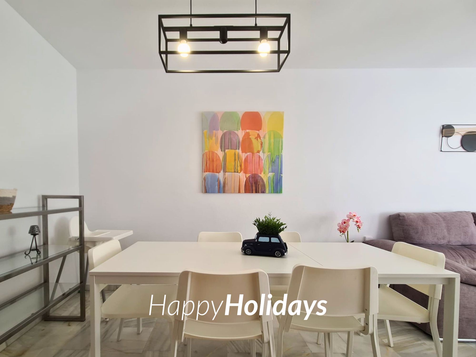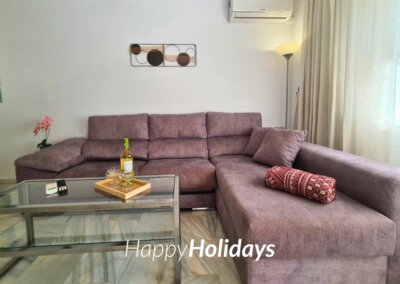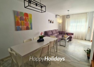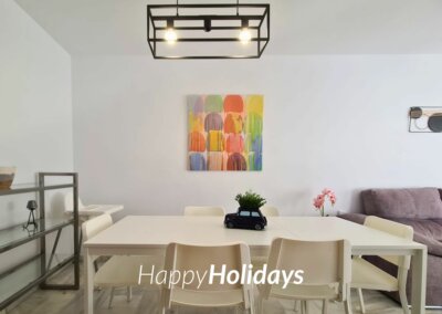 HH Palmeras tiene un amplio salón comedor con A/A y salida a una bonita terraza con vistas al jardín y a la piscina. Decorado especialmente para el uso y disfrute de nuestros huéspedes para que puedan sentirse como en casa.
