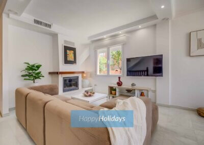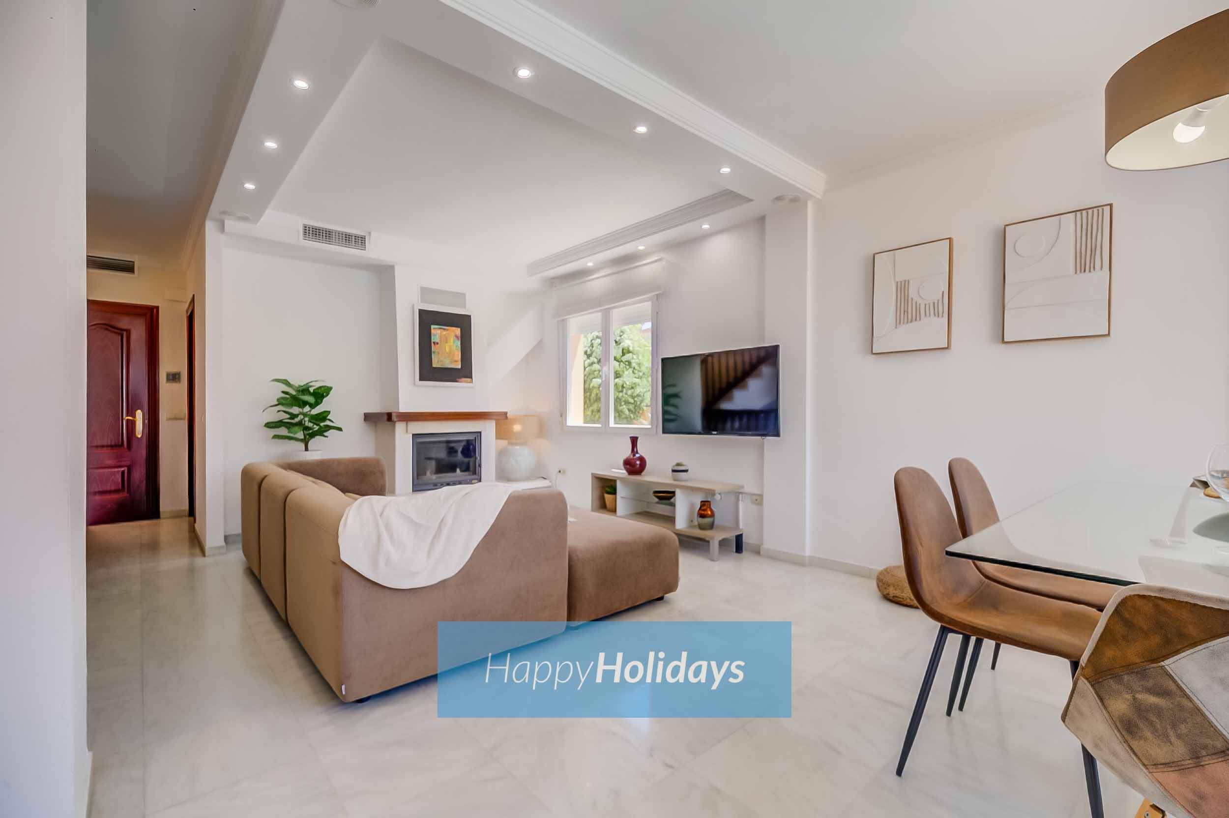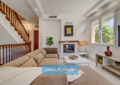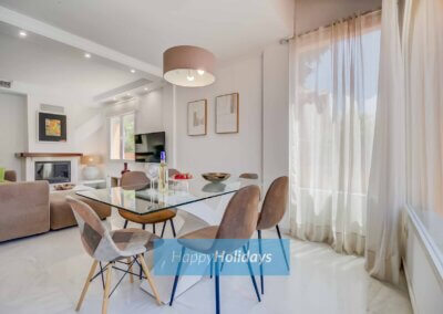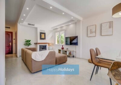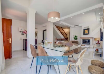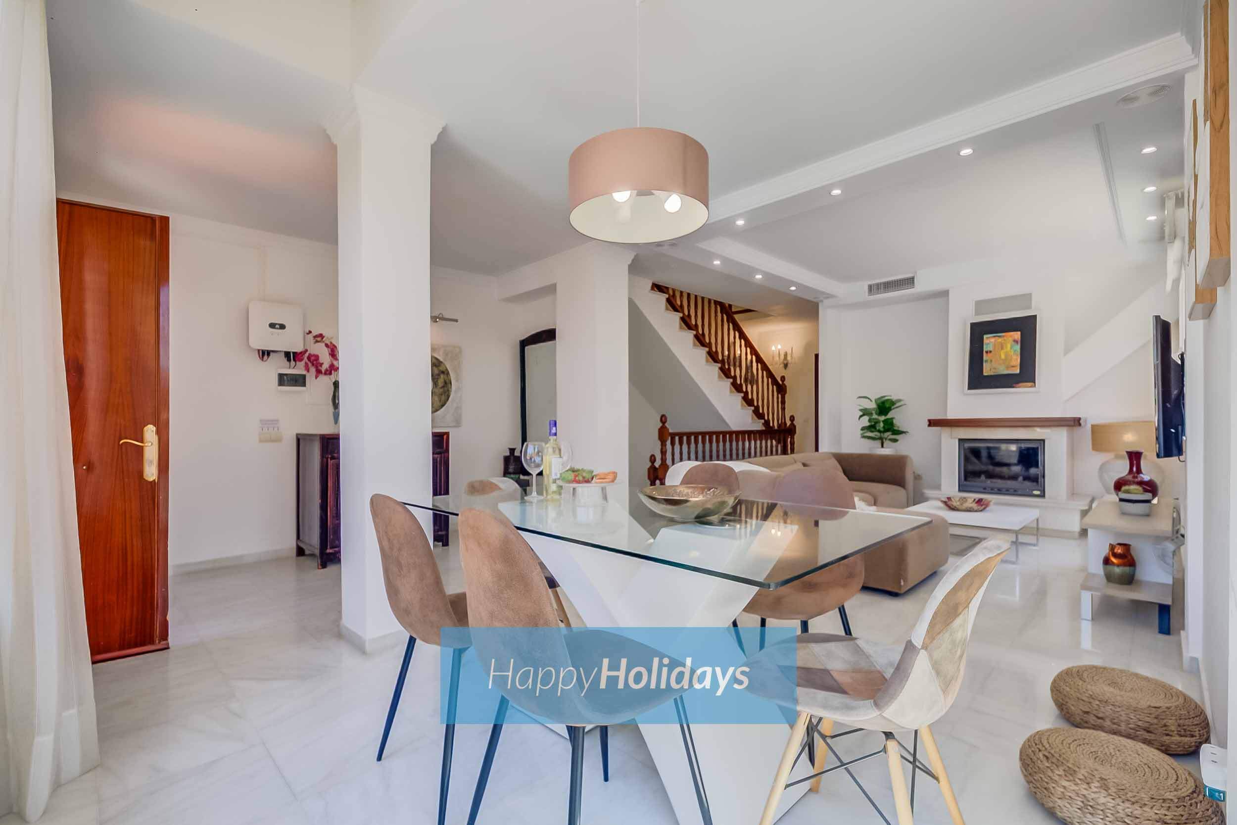 Salón muy acogedor con chimenea y zona de comedor con vistas al jardín y piscina. Encontrará servicios tan lujosos como bañera jacuzzi para 2 personas, chimenea en el salón o aire y calefacción independientes en cada estancia.